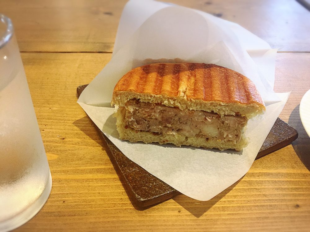 サンドイッチモーニングの1品、コーンビーフみたいなのが挟まってて肉肉しい。