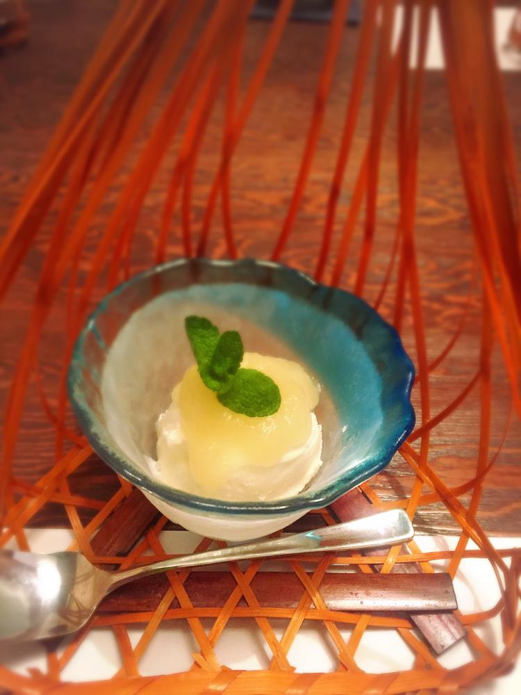 最後は器もかわいい、パイナポーソースがかかったバニラアイスですキンキンに冷えてお口直しにピッタリな1品でした、例えるなら真冬の澄み切った空に流れる流れ星とだけ表現させて下さい。
