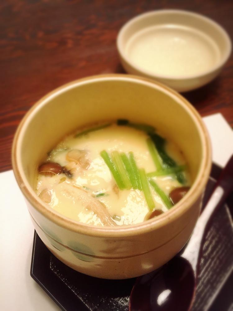 続いてあっつあつの茶碗蒸しが届きました。 あっさりしたお味なのですがアサリやエノキの出汁がしっかりと効いてます、夏の日の木陰の中で蜜を吸ってるカブトムシとその仲間達とでも表現しときます。