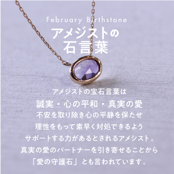 アメジストの宝石言葉は 誠実・心の平和・真実の愛 不安を取り除き心の平静を保たせ理性をもって素早く対処できるよう サポートする力があるとされるアメシスト。 真実の愛のパートナーを引き寄せることから 「愛の守護石」とも言われています。