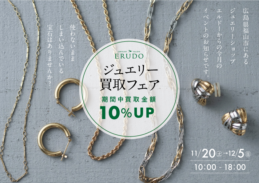お家で使わないまましまい込んでいる宝石はありませんか?今月エルドーではジュエリー買取フェアを開催いたします。 年末の大掃除、お家の収納整理中に、使わなくなった宝石がでてきましたら、この機会にご来店ください。期間中「買取フェアの広告をみた」と店頭でお伝えいただきましたら、買取金額を10%アップさせていただきます♪