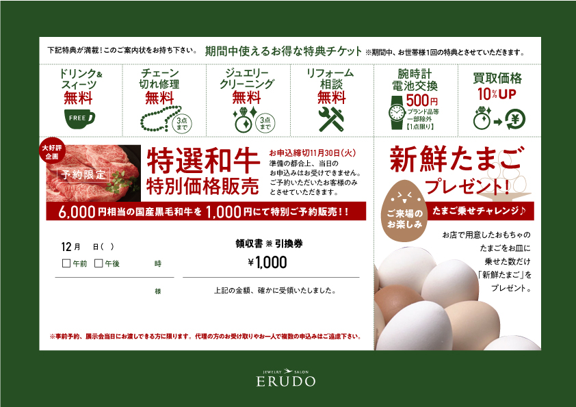 期間中、特典も満載です。上記特典は店頭で画面表示していただければご利用いただけます。※特選和牛特別価格販売に付きましては事前のご予約が必要です。 ご予約は「店舗へお電話 084-928-6171」「LINE」にて対応させていただきます。代理の方のお受け取りやお一人で複数の申し込みはご遠慮下さい。
