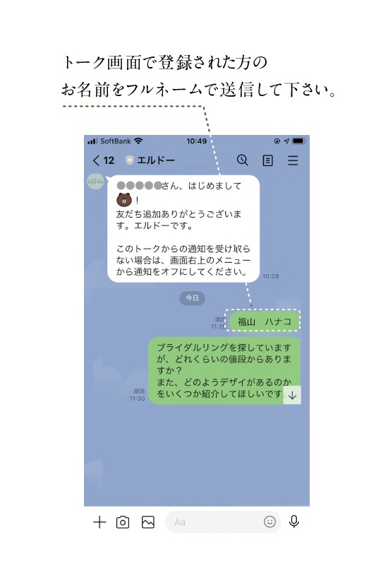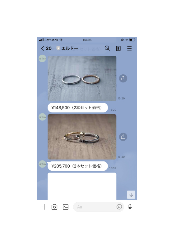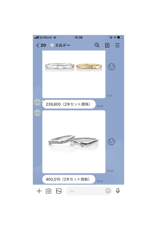 エルドーではLINEを使って、ブライダルリングのご相談していただくことができます。お客様のご質問ご要望などをLINEでお伝えいただければ、スタッフが対応させていただきます。