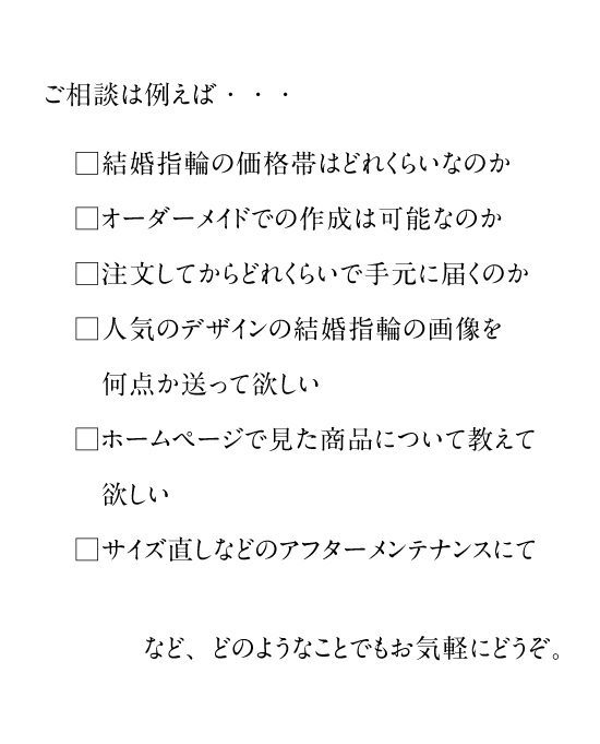 遠方で来られるのが難しい方や、迷っているけれど軽く相談してみたい方はお気軽にお問い合わせ下さい。