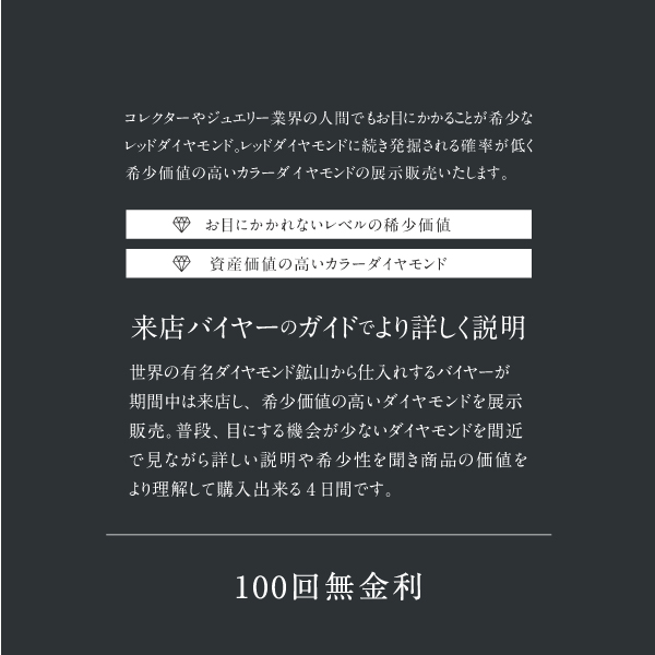 コレクターやジュエリー業界の人間でもお目にかかることが希少なレッドダイヤモンド。レッドダイヤモンドに続き発掘される確率が低く希少価値の高いカラーダイヤモンドを期間中来店バイヤーのガイドで展示販売いたします。