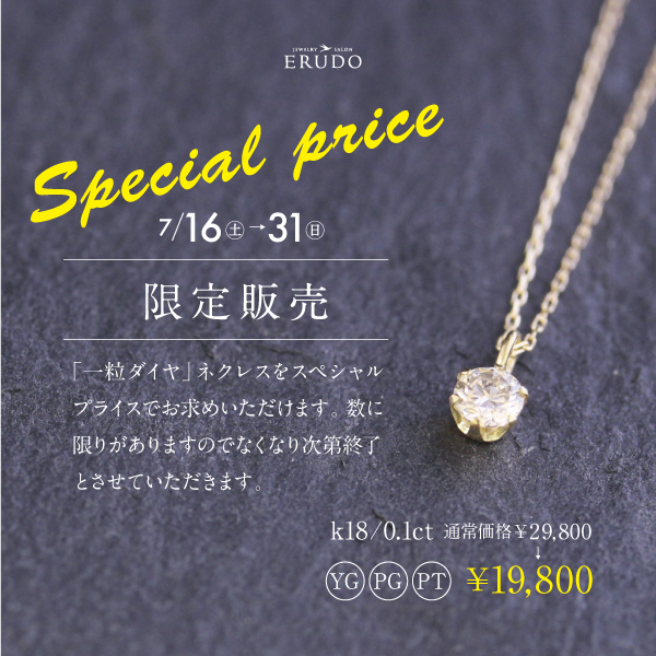 シンプルで世代・時代を選ばない「一粒ダイヤ」ネックレスを7月16日〜31日の間、期間限定でスペシャルプライス販売いたします。0.1カラットダイヤ18金(YGイエローゴールド/PGピンクゴールド/PTプラチナのいずれかをお選びいただけます。)色褪せず受け継いでいけるネックレスをお得にお求めいただけるチャンスです。数に限りがありますので、なくなり次第終了とさせていただきます。