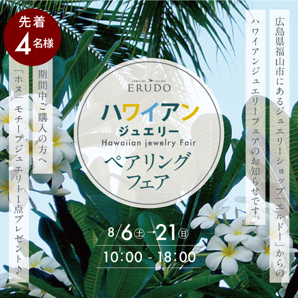 HOME > お知らせ > 「ハワイアンジュエリーペアリング」フェア 「ハワイアンジュエリーペアリング」フェア 2022.08.01. ハワイアンジュエリーには、身に着ける人を災いから守ったり、 幸福をもたらしたりするといった効果があると言い伝えられています。 そして、さまざまな意味を持つモチーフのバリエーションから 自分の願いとリンクするモチーフを選べるのも魅力です。 ※ご質問等は、以下のいずれかの方法でお願い致します。 「店舗へお電話 084-928-6171」「LINE」「e-mail」 < 前を読む 次を読む > < 一覧に戻る お知らせ リフォーム 修理 買取 エルミシュラン オーナーブログ