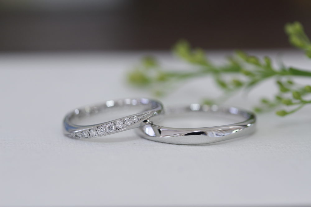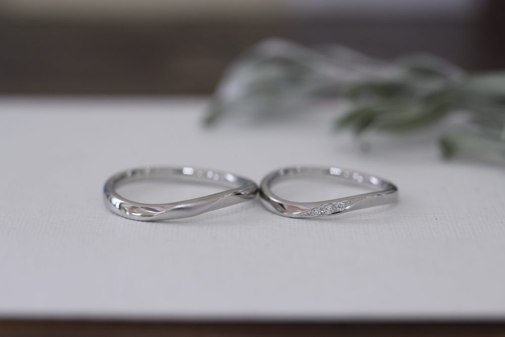奥様のリングはK18PGのお素材にS字のラインでダイヤが流れるようにはいっています。