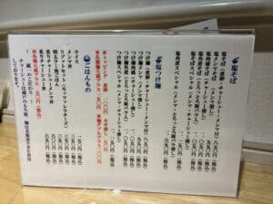 メニュー表だ塩蕎麦が売りの店でサイドメニューも充実してる