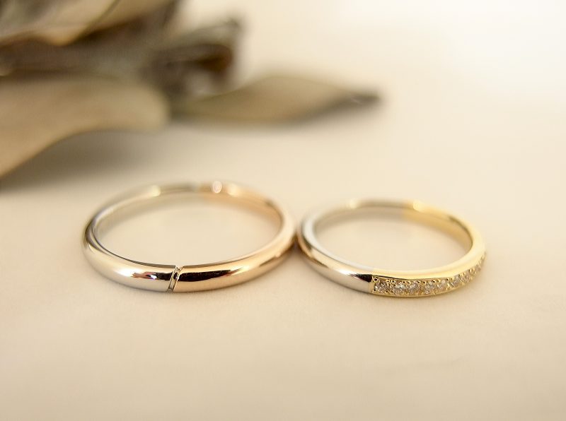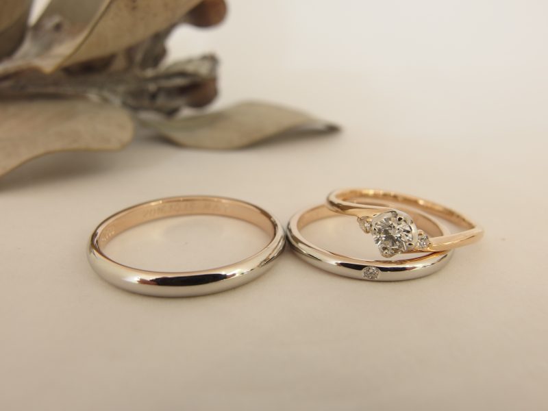 エンゲージ:シャトンがプラチナで、アームがK18PGにされたので、マリッジも内側K18PGで外側がプラチナ仕上げのコンビタイプでおそろいに。