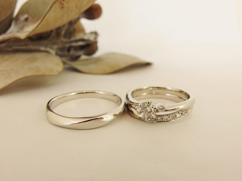 王道のマリッジリング(結婚指輪)にエンゲージリング(婚約指輪/ダイヤ込み)でシンプル仕上げに。