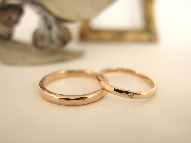 アフラックスの『リトルハニー』をアレンジして、レディースにはリングの半分にメレダイヤを敷き詰めました。シンプルですが、一気にゴージャスに!