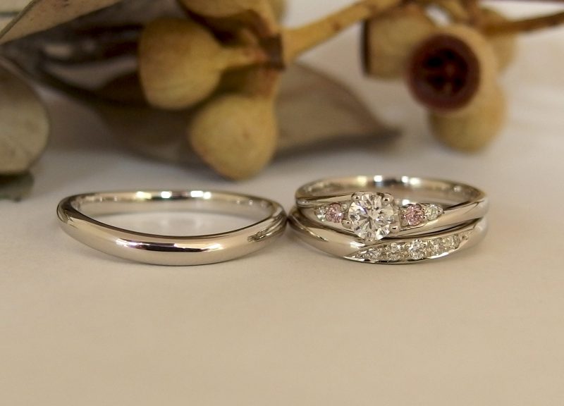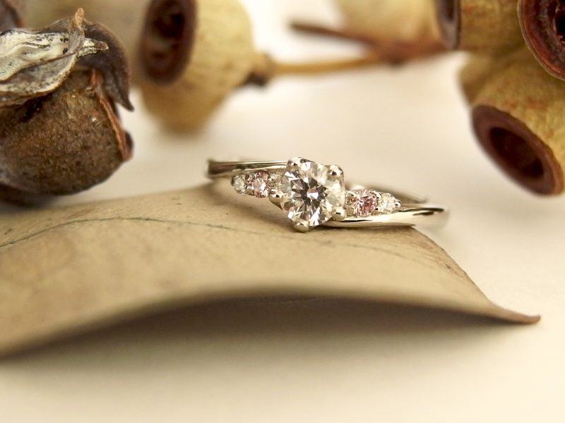 エンゲージリング(婚約指輪/ダイヤ込み)には、サイドにピンクダイヤを入れられて、オリジナル感を演出。