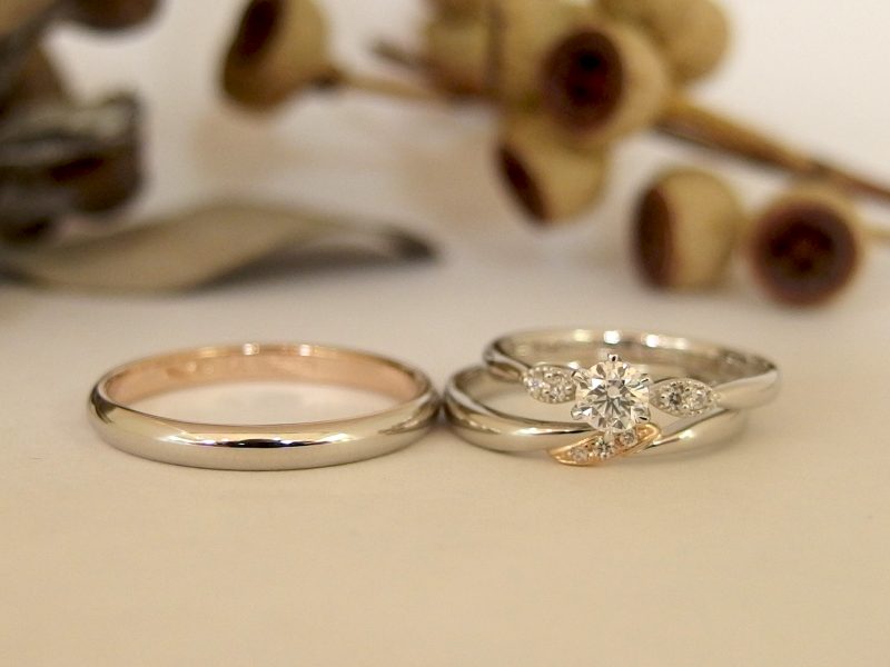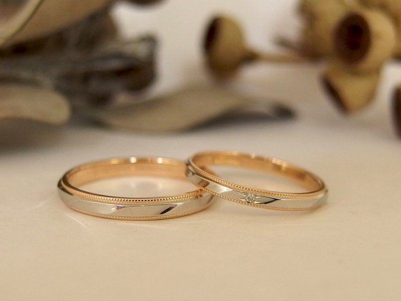 メンズ・レディースともに、内側とミルがK18PGのコンビ仕上げ。すべてPt900でお作りすることも可能です。