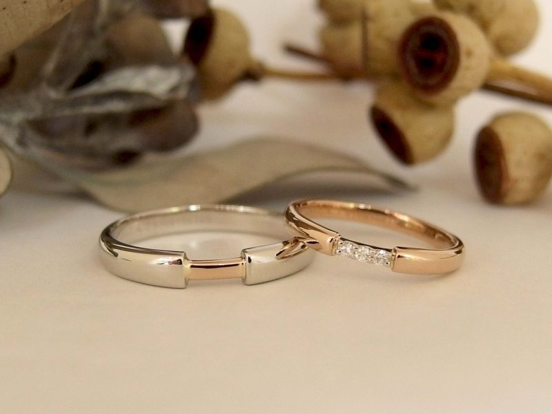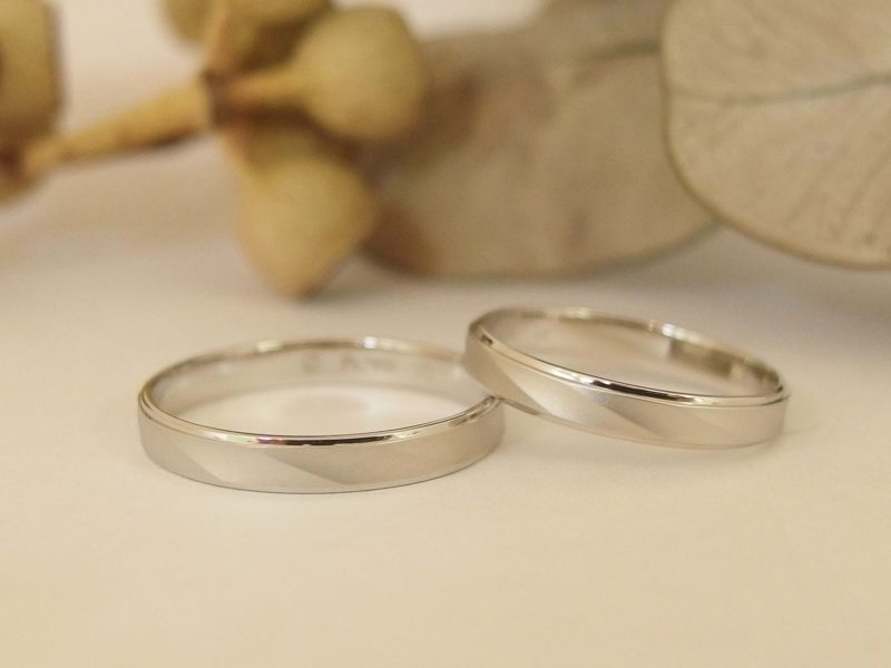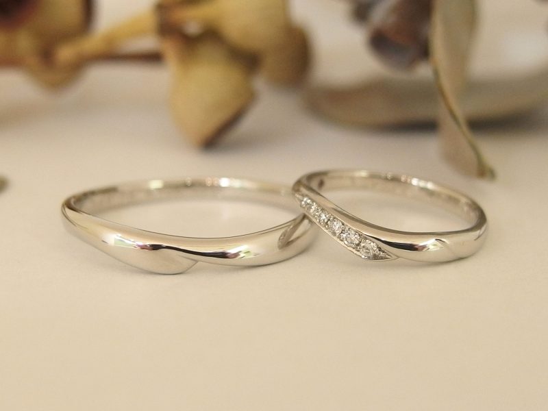 メンズ・レディースともにPt900。レディースはダイヤありのデザインだったんですが、ダイヤはないデザインがご希望だったので、メンズのデザインでサイズを小さくしてお作りしました。こういうパターンも可能ですので、お気軽にお声かけください。