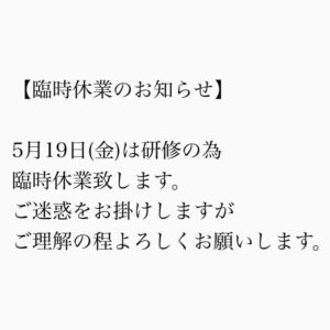 5月19日(金)は社員研修の為臨時休業となります。